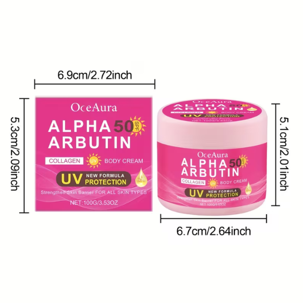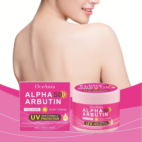 Oceaura Alpha Arbutin Body Cream Helps Lighten Dark Spots, Hyperpigmentation, and Uneven Skin Tone. Enriched With Alpha Arbutin, It Deeply Nourishes and Hydrates Skin for a Radiant, Smooth, and Glowing Appearance. Ideal for Daily Use on All Skin Types.