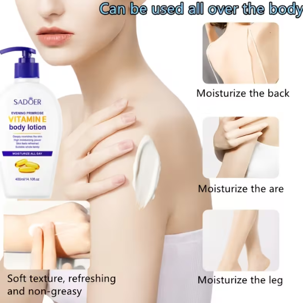 Sadoer Vitamin E Body Lotion Is A Powerful Moisturizing Formula Designed To Deeply Nourish, Protect, And Repair Dry And Damaged Skin. Enriched With Vitamin E, This Lotion Helps Restore Skin Softness, Improve Elasticity, And Maintain Long-lasting Hydration. Its Lightweight, Fast-absorbing Texture Makes It Ideal For Daily Use On All Skin Types.